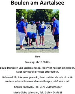 Boule trainieren und spielen am See. Jede/r ist herzlich eingeladen. Es ist keine große Fitness erforderlich.