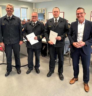 Der ehemalige stellvertretende Kreisbrandinspektor Dirk Schumacher wurde nach knapp fünf Jahren feierlich aus dem Ehrenbeamtenverhältnis entlassen. Kristopher-Kirsten Heinzwurde nun zum neuenStellvertretenden Kreisbrandinspektor ernannt und hat die Position am 1. Juni 2025 übernommen. Kreisbrandinspektor Harald Stürtz und Landrat Carsten Braun beglückwünschten den neuen im Amt und bedankten sich bei Schumacher für seinen wertvollen Dienst.
