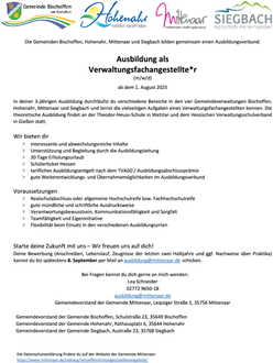 In deiner 3-jährigen Ausbildung durchläufst du verschiedene Bereiche in den vier Gemeindeverwaltungen Bischoffen, Hohenahr, Mittenaar und Siegbach und lernst die vielseitigen Aufgaben eines Verwaltungsfachangestellten kennen. Die theoretische Ausbildung findet an der Theodor-Heuss-Schule in Wetzlar und dem Hessischen Verwaltungsschulverband in Gießen statt.