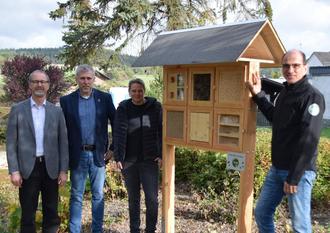 Marco Müller (links) und Markus Hief (rechts) von der EAM übergaben das XXL-Insektenhotel an Bischoffens Bürgermeister Marco Herrmann. Mit dabei Christine Nadler (Bauabteilung) von der Gemeinde.