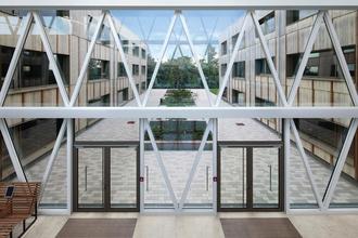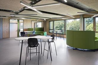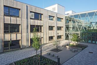 Der innovative Neubau der Theodor-Heuss-Schule schafft mit Holzbauweise und der verglasten Pausenhalle ein helles und warmes Ambiente.