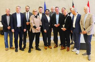 von links nach rechts: Jürgen Mock (Bürgermeister Ehringshausen), Christian Schwarz (Bürgermeister Aßlar), Jan Schneider (Regierungsvizepräsident), Cirsten Kunz-Strueder (MdL), Johannes Volkmann (Kreistagsvorsitzender), Kaweh Mansoori (Hessischer Minister für Wirtschaft, Energie, Verkehr, Wohnen und ländlichen Raum), Harald Danne (Kreis-Wirtschaftsdezernent), Landrat Carsten Braun, Frank Steinraths (MdL), Dagmar Schmidt (MdB), Jörg Michael Müller (MdL), Dr. Matthias Büger (MdL) und Carsten Seelmeyer (Haiger) sind sich einig: Es muss eine Lösung zum Erhalt der Behelfsausfahrt „Am Behlkopf“ zum Abfallwirtschaftszentrum Aßlar geben! Foto: Lahn-Dill-Kreis