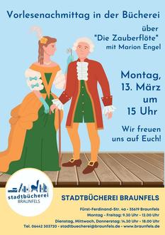 Los geht es am Montag, den 13. März 2023, um 15 Uhr. Ihr seid eingeladen, viel Spannendes, Humorvolles und vor allem Begeisterndes über Wolfgang Amadeus Mozarts Oper „Die Zauberflöte“ zu erfahren. Marion Engel wird Euch eine Stunde lang Geschichten über die Entstehung des bekannten Musikstücks vorlesen.