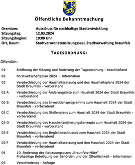 | 03 | Verabschiedung der Haushaltssatzung und des Haushaltsplans 2024 der Stadt Braunfels - vorberatend |