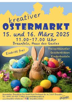 Am Samstag, den 15. und Sonntag, den 16. März öffnet der beliebte Braunfelser Ostermarkt wieder seine Tore und lädt zum Bummel zwischen den zahlreichen Ständen im Haus des Gastes ein. Jeweils von 11 – 17 Uhr gewähren die über 50 Stände einen ersten Blick auf die diesjährigen Ostertrends. Der Ostermarkt findet mit einer Premiere statt: Das erste Mal befindet sich eine Ausstellerfläche auch im „Kleinen Saal“, mit dem Bereich Kinderbasteln und weiteren kreativen neuen Anbietern. Im Angebot sind verschiedene frühlingshafte Dekorationen, Ostereier, floristische Kränze und Gestecke sowie Kerzen, selbst gemachte Teddys und Kinderbekleidung, Schmuck, Seifen sowie Glückwunschkarten und Geschenkkartons. Zudem werden verschiedene Holz- und Näharbeiten, Töpfer- und Tiffany-Artikel vorgestellt.