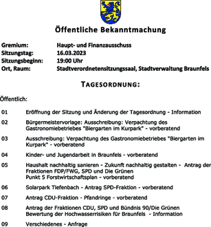 | Ort, Raum: | Stadtverordnetensitzungssaal, Stadtverwaltung Braunfels |