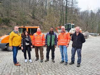 Kurz vor Beendigung des zweiwöchigen Praktikums besuchten der Flüchtlingskoordinator der Stadt Braunfels, Joachim Schmidt (l.), sowie die Mitarbeiterin in der Flüchtlingshilfe der Stadt Braunfels, Nurcan Adigüzel (2. v. l.), den Praktikanten Oumar Sidibe (3. v. r.) auf dem Bauhof der Stadt Braunfels. Bauhofleiter Jürgen Pauly (2. v. r.), Alexander Mohr (3. v. l.), der die Betreuung des Praktikanten übernahm und Marco Kühnel (r.), ebenfalls Mitarbeiter auf dem Bauhof, zeigten sich äußerst zufrieden mit Oumar Sidibe. (Foto: Stadt Braunfels)