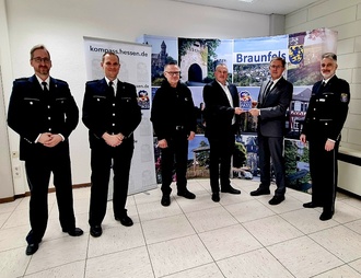 Braunfels wurde während einer Auftaktveranstaltung offiziell als Kompass-Kommune begrüßt. V.l.: Polizeioberkommissar Thorsten Weller, Kriminalhauptkommissar Andreas Marx, Stadtverordnetenvorsteher Michael Hollatz, Bürgermeister Christian Breithecker, Polizeipräsident Bernd Paul, Kriminaldirektor Joachim Bernard (Foto: Stadt Braunfels)