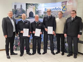 Bürgermeister Christian Breithecker überreichte den drei Amtsträgern ihre Urkunden: „Allen drei Kameraden gratuliere ich herzlich zur Wahl. Die Ämter, die Sie ehrenamtlich übernehmen, sind für unsere Gesellschaft enorm wichtig. Durch Ihren Einsatz für die Allgemeinheit tragen Sie dazu bei, unser Braunfels sicherer zu gestalten. Dafür möchte ich Ihnen im Namen des Magistrats der Stadt Braunfels danken.“