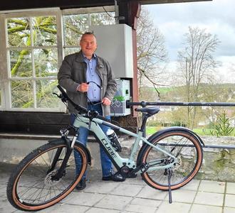 Bürgermeister Christian Breithecker begrüßt den neuen Service für E-Radelnde an drei Standorten in Braunfels. (Foto: Stadt Braunfels)