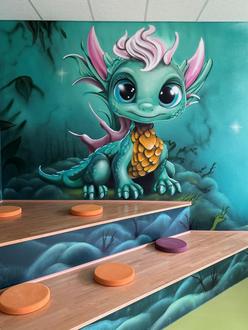 In der neuen Bücherei schmückt ein Lesedrache die Wand. (Foto: Lahn-Dill-Kreis)