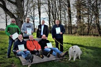 Urkundenverleihung: vorne v.l.: Alexander Schneider, Günter Krooß,Niels Engelmann, hinten: Heinfried Obitz,Jan Meiser, Christian Breithecker und Jörg Hofmann mit Nanuk