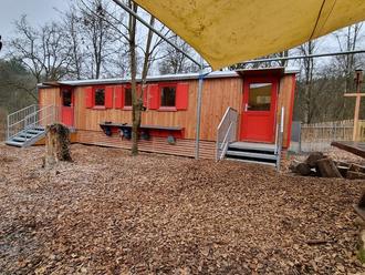 Wer das Gelände der Waldkita in Braunfels betritt, kann ab sofort den neuen Unterschlupf für die kleinen „Fledermäuse“ bestaunen: Ein zwölf Meter langer Bauwagen aus Holz mit roten Elementen. Er dient – neben dem bereits bestehenden Bauwagen – als zusätzlicher Rückzugsort bei schlechtem Wetter. Der zweite Wagen war notwendig geworden, weil die Waldkita sich im vergangenen Jahr mit einer zweiten Gruppe vergrößert hatte. Mittlerweile können hier bis zu 50 Kinder betreut werden, was deutlich mehr Platz erfordert. Auch der Außenbereich wurde entsprechend erweitert und um eine Feuerstelle und Bänke zum gemeinsamen Beisammensitzen ergänzt.