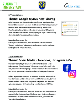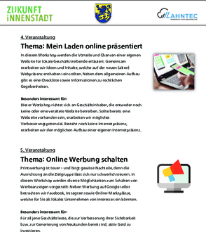 Anschließend finden innerhalb der Veranstaltungsreihe „Mit Online-Maßnahmen Offline-Kunden anlocken“ an weiteren vier Tagen Workshops zu den Themen „Google MyBusines-Eintrag“, „Social Media - Facebook, Instagram & Co.“, „Mein Laden online präsentiert“ und „Online Werbung schalten“ statt.