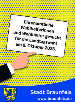Interessentinnen und Interessenten, im Wahlvorstand oder Briefwahlvorstand mitarbeiten möchten, können sich unter Angabe der persönlichen Daten (Name, Vorname, Anschrift, Geburtsdatum und Telefonnummer) bei der Stadtverwaltung Braunfels - Wahlamt, Hüttenweg 3, 35619 Braunfels oder unter den Telefonnummern 06442 303-0 bzw. -100 melden.