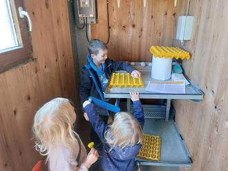 Beim Besuch des Biohof Gath löste sich das Rätsel, denn dort durften alle Kinder in die Hühnerställe und den Hühnern beim Eier legen zuschauen. Mit einer Handkurbel wurden, unter der Anleitung von Linus Gath, die Eier über ein Förderband aus dem Stall transportiert.