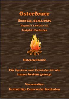 Zu unserem traditionellen Osterfeuer am Ostersonntag ab 17:00 Uhr auf dem Festplatz in Bonbaden laden wir Jung und Alt ganz herzlich ein.
