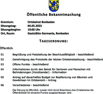 Die Sitzung ist öffentlich, soweit nicht durch Beschluss des Ortsbeirates die Öffentlichkeit für einzelne Punkte ausgeschlossen wird.