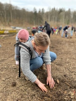 Für uns teilnehmende Eltern war das eine rundum gelungene und bereichernde Aktion. Zum einen durch die Begegnungen anderer Familien, in denen seit 2022 Babys geboren wurden und zum anderen durch den großen Wissenszuwachs über das Pflanzen von Bäumen, die Organisation einer Kulturbegründung und die Sicherung der jungen Forstpflanzen gegen Wild-Verbiss.