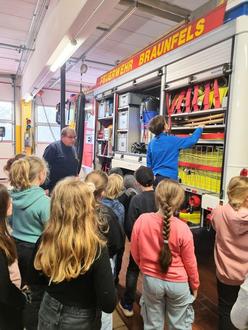 Ein Highlight für die Grundschulkinder während der Rathausbesichtigung war die Feuerwehr. Stadtbrandinspektor Michael Rack erklärte den Kindern den Aufgabenbereich der Feuerwehr und ging dabei auch auf das Ehrenamt ein. Im Anschluss durften die Grundschulkinder sich ein Feuerwehrauto von innen anschauen, was für Strahlen in den Augen sorgte.
