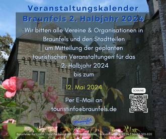 Die Braunfelser Kur GmbH bittet alle Vereine und Organisationen in Braunfels und den Stadtteilen um Mitteilung der geplanten touristischen Veranstaltungen für das zweite Halbjahr 2024 bis zum 12. Mai 2024. Nur rechtzeitig angemeldete Veranstaltungen können in den Veranstaltungskalender aufgenommen werden. Der Veranstaltungskalender wird als Druckversion sowie als PDF-Version auf der Homepage der Braunfelser Kur GmbH auf www.braunfels-erleben.de abrufbar sein.