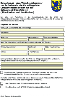 Gerne können Sie uns das unterschriebene und eingescannte Formular auch per E-Mail an joerg.dinges@braunfels.de zusenden. Ein digitales Bewerbungsformular finden Sie im Bürgerbereich unserer Website www.braunfels.de in der Rubrik Ansprechpartner unter dem Punkt Ortsgerichte oder in der Rubrik Amtliche Bekanntmachungen.