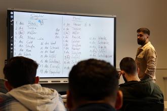 16 junge Männer sitzen in einem Klassenraum, es ist sehr still. Alle hören konzentriert zu und schreiben mit, als Sezer Ertürk Plural-Formen abfragt. Er ist Mitarbeiter in der Abteilung Zuwanderung und Beruf bei der Gesellschaft für Wirtschaftsförderung, Ausbildungs- und Beschäftigungsinitiativen (GWAB) und unterrichtet aktuell Geflüchtete in Deutsch. "Das Haus - wie heißt dann der Plural?", fragt er. "Hauser?", antwortet ein junger Mann zögerlich. Sezer Ertürk sagt: "Versuchen Sie es noch einmal mit Umlaut." Schon kommt die Antwort mehrstimmig aus den Reihen: "Häuser!"