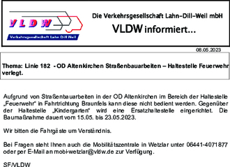 Aufgrund von Straßenbauarbeiten in der OD Altenkirchen im Bereich der Haltestelle „Feuerwehr“ in Fahrtrichtung Braunfels kann diese nicht bedient werden. Gegenüber der Haltestelle „Kindergarten“ wird eine Ersatzhaltestelle eingerichtet. Die Baumaßnahme dauert vom 15.05. bis 23.05.2023.