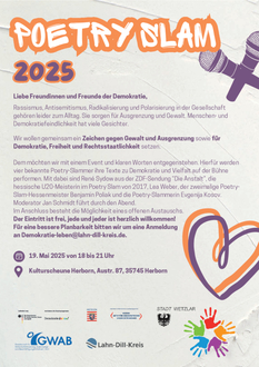 Mit diesem Event möchte der Lahn-Dill-Kreis Themen wie Rassismus, Antisemitismus, Radikalisierung und Polarisierung in der Gesellschaft mit klaren Worten entgegenstehen. Hierfür werden vier bekannte Poetry-Slammerinnen und -Slammer ihre Texte zu Demokratie und Vielfalt auf der Bühne performen. Mit dabei sind unter anderem René Sydow aus der ZDF-Sendung „Die Anstalt”, die hessische U20-Meisterin im Poetry Slam von 2017, Lea Weber, der zweimalige Poetry-Slam-Hessenmeister Benjamin Poliak sowie die Poetry-Slammerin Evgenija Kosov. Moderator Jan Schmidt führt durch den Abend. Im Anschluss besteht die Möglichkeit eines offenen Austauschs.