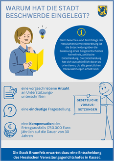 Eine solche Zulassung orientiert sich ausschließlich an den gesetzlich vorgeschriebenen Voraussetzungen, die erfüllt sein müssen. Die Organisatoren des Bürgerbegehrens und der Magistrat der Stadt Braunfels haben dazu unterschiedliche Auffassungen.