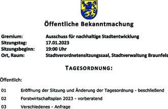 | Ort, Raum: | Stadtverordnetensitzungssaal, Stadtverwaltung Braunfels |