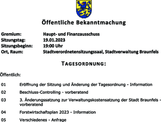| Ort, Raum: | Stadtverordnetensitzungssaal, Stadtverwaltung Braunfels |