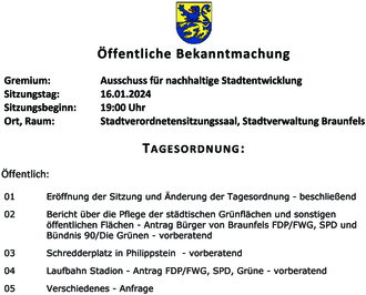 | Ort, Raum: | Stadtverordnetensitzungssaal, Stadtverwaltung Braunfels |