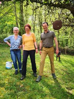 Herr Fuchs erläuterte die ersten Maßnahmen, die im Obstgarten vorgesehen sind. Für die Einfriedung ist eine Benjeshecke vorgesehen, das Holz hierfür entsteht bei den jährlichen Schnittmaßnahmen der Obstbäume. Zusammen mit den Gästen konnte bereits ein erster Heckenabschnitt von rd. 10 Meter Länge errichtet werden. Eine solche Hecke schont nicht nur die Ressourcen für den Abtransport und das Häckseln, sie fördert zusätzlich die Biodiversität des Gehölzsaumes, der den Obstgarten umgibt. Die Pflege der Grünfläche soll ebenfalls extensiviert werden. Vorgesehen ist eine 2 schürige Wiesennutzung. Das hierbei entstehende Heu, wird ebenfalls in den Aufbau der Benjeshecke integriert. Mit der Wiesennutzung wird nicht nur die Artenvielfalt gefördert, hierdurch behält auch die Grasnarbe ihren natürlichen Schutz vor Sonne und Trockenheit.