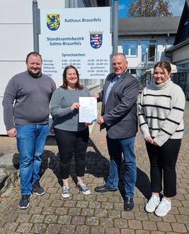 Der Fördermittelbescheid des Lahn-Dill-Kreises traf kürzlich im Braunfelser Rathaus ein: (v. l.) Christian Eckhardt, Fachdienstleiter Recht und Vergabe; Stadtjugendpflegerin Nadine Hundert, Bürgermeister Christian Breithecker und Eileen Grimmer, Duale Studentin der Stadt Braunfels. (Foto: Stadt Braunfels)