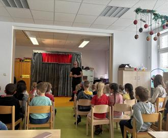 Am Donnerstag, 15. Mai 2025, war der Kasper zu Besuch in der Kita „Lindwurm". Mit seiner Geschichte vom versteinerten Prinzen zog er Groß und Klein in seinen Bann.