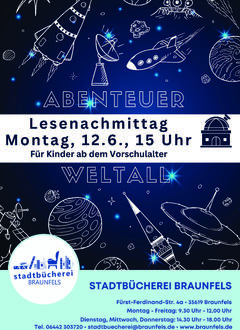 Angeboten wird diese Veranstaltung für Kinder ab dem Vorschulalter. Fachlich wird das ehrenamtliche Team der Stadtbücherei von der Sternwarte in Solms, vertreten durch den Vorsitzenden Thomas Düring unterstützt.