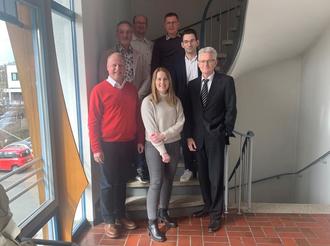 Beim Gespräch zwischen Kreis-Wirtschaftsförderung und Kreishandwerkerschaft Lahn-Dill wurden einige wichtige Themen diskutiert. Von links: Andreas Groß, Kreishandwerksmeister, Obermeister Kraftfahrzeuggewerbe; Stefan Zienert, stellvertretender Kreishandwerksmeister, Meister im Installateur und Heizungsbauerhandwerk; Jens Rödel, stellvertretender Kreishandwerksmeister, Meister im Dachdecker- und Klempnerhandwerk; Jessica Schaaf, Leitung Stabsstelle Wirtschaftsförderung beim Lahn-Dill-Kreis; Steffen Schnorr, Beisitzer Kreishandwerkerschaft Lahn-Dill; Sebastian Hoffmanns, Geschäftsführer Kreishandwerkerschaft Lahn-Dill; Prof. Dr. Harald Danne. Foto: Lahn-Dill-Kreis