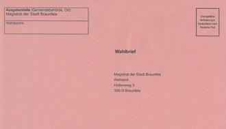Diese Wahlbriefe wurden dem Wahlamt der Stadt Braunfels von der Landeswahlleitung zur Verfügung gestellt, wobei der Hinweis auf die Direktwahl des Landrates nicht aufgenommen wurde.