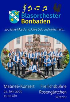 Das Blasorchester der Freiwilligen Feuerwehr Bonbaden spielt am 22.06.2025 im Rosengärtchen in Wetzlar. Unser musikalischer Leiter Simon Kranz hat ein abwechslungsreiches Programm mit viel traditioneller Blasmusik und moderner Unterhaltungsmusik nach dem Motto „100 Jahre Mosch, 90 Jahre Udo“ zusammengestellt. Der Eintritt ist frei.