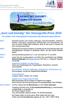 Weitere Informationen stellt das Land Hessen unter https://staatskanzlei.hessen.de/unsere-themen/demografie/auslobung-demografie-preis-2024 zur Verfügung.