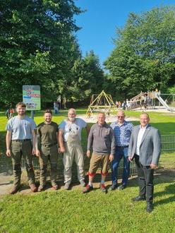 In Tiefenbach wurde eine wahre Spieloase für Klein und Groß eröffnet: (v. l.) Forstwirt Emil Reiter; Forstwirtschaftsmeister Jan-Hubertus Müller; Bauhofmitarbeiter Martin Armbruster; Bauhofmitarbeiter und Vorarbeiter für den Bereich städtische Liegenschaften, Straßen, Wege und Plätze, Bernd Sidorenko; Bauhofleiter Jürgen Pauly und Bürgermeister Christian Breithecker. (Foto: Stadt Braunfels)