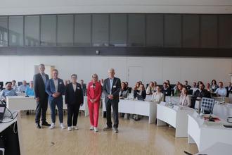 Viele Akteurinnen und Akteure aus Unternehmen, Verwaltungen, Schulen, Kammern und sozialen Einrichtungen kamen zusammen, um über die Zukunft der Wirtschaftsregion Lahn-Dill zu sprechen. Vorne von links: Vize-Landrat und Erster Kreisbeigeordneter Frank Inderthal, Carsten Braun, Dr. Christa Larsen, Claudia Wesner, Prof. Dr. Harald Danne. (Foto: Lahn-Dill-Kreis)