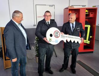Während der offiziellen Eröffnungsfeier übergab Bürgermeister Christian Breithecker (l.) den symbolischen Schlüssel an Stadtbrandinspektor Michael Rack (Mitte) und den Wehrführer der Freiwilligen Feuerwehr Altenkirchen Martin Bettner (r.). (Foto: Stadt Braunfels)