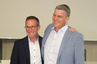 Carsten Braun (links) und Frank Inderthal (rechts) betonten am Wahlabend ihre gegenseitige Dankbarkeit für den fairen Wahlkampf. (Foto: Lahn-Dill-Kreis/Nicole Zey)