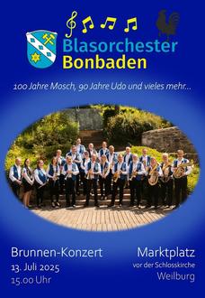 Das Blasorchester der Freiwilligen Feuerwehr Bonbaden spielt am kommenden Sonntag, dem 13.07.2025 von 15:00 Uhr bis 16:00 Uhr auf dem Marktplatz in Weilburg. Unser musikalischer Leiter Simon Kranz hat ein abwechslungsreiches Programm mit viel traditioneller Blasmusik und moderner Unterhaltungsmusik nach dem Motto „10 Jahre Mosch, 90 Jahre Udo“ zusammengestellt.