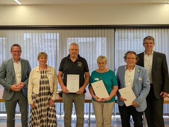 Nahmen an der Feierstunde in Wetzlar teil (von links): Carsten Braun, Manuela Schupp, Andreas Seipp, Evelyne Driesen, Andreas Flick, Erster Kreisbeigeordneter und Vize-Landrat Frank Inderthal. (Foto: Lahn-Dill-Kreis)