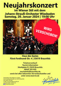 Das Neujahrskonzert im Wiener Stil mit dem Johann-Strauß-Orchester aus Wiesbaden, das am Samstag, 20. Januar, im „Haus des Gastes“ stattfinden sollte, muss verschoben werden. Das Konzert wird voraussichtlich im September nachgeholt.