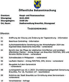 Aufsichtsbehördliche Genehmigung des Wirtschaftsplan 2024 des Eigenbetriebes Stadtwerke Braunfels - vorberatend