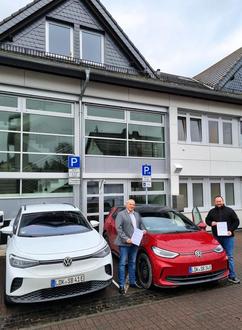 Ein ID 3 und ein ID 4 sind nun Teil der Fahrzeugflotte der Braunfelser Stadtverwaltung: (v. l.) Bürgermeister Christian Breithecker und Christian Eckhardt, Fachdienstleiter Recht und Vergabe. (Foto: Stadt Braunfels)